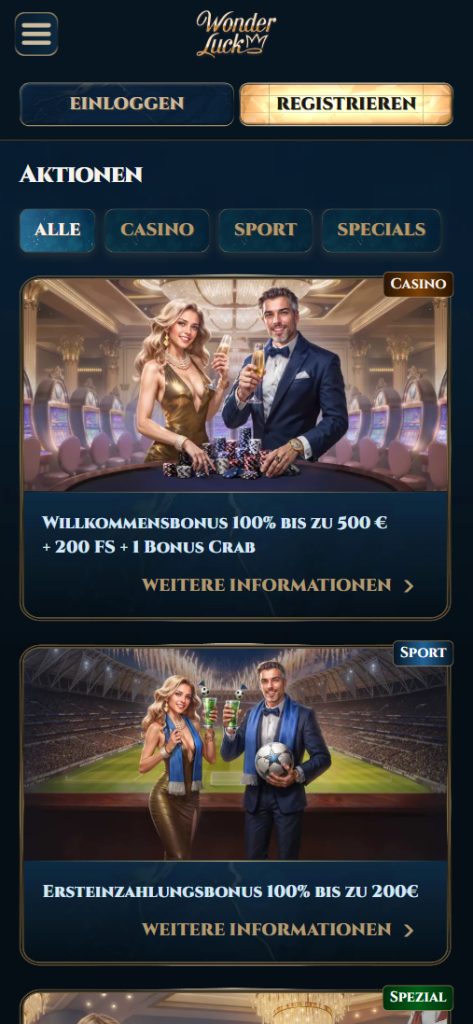 - Willkommensbonus. Als Neukunde von WonderLuck erhalten Sie Ihren ersten Bonus direkt nach der ersten Einzahlung. Dеr Willkommensbonus bringt Ihnen 225% bis zu 1.000€ auf die Ersteinzahlung, аuch per WonderLuck App.