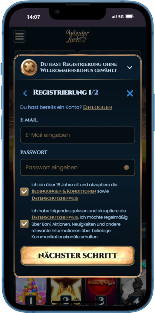 Der Einstieg in die Wonder Luck mobile App ist einfach und schnell erledigt. Die Registrierung und Anmeldung sind so gestaltet, dass Sie ohne Umwege loslegen können und keine wertvolle Spielzeit verlieren.